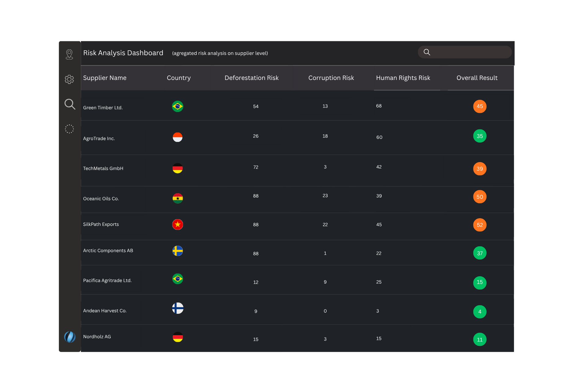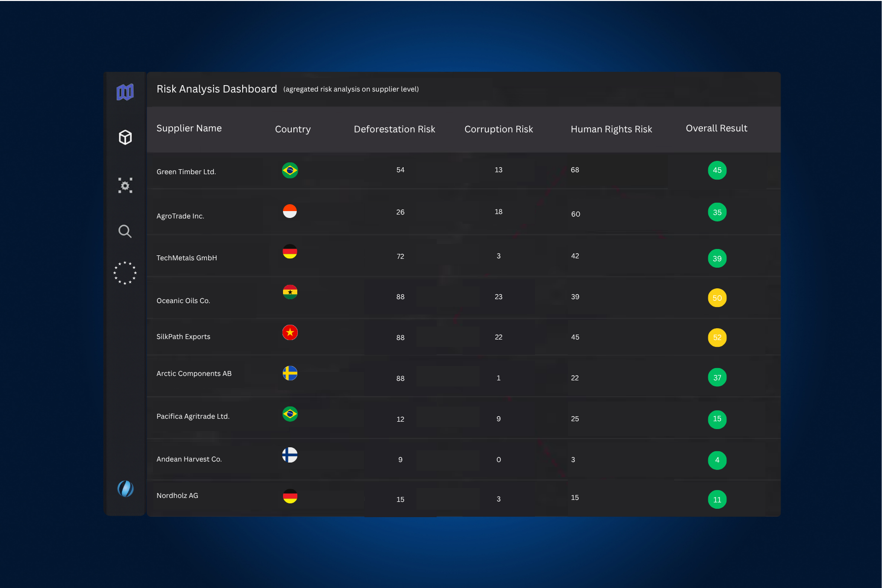 A clear, data-driven view of your supply chain’s compliance landscape. The Supplier Risk Analysis Dashboard brings together key risk indicators — including deforestation exposure, corruption levels, and human rights concerns